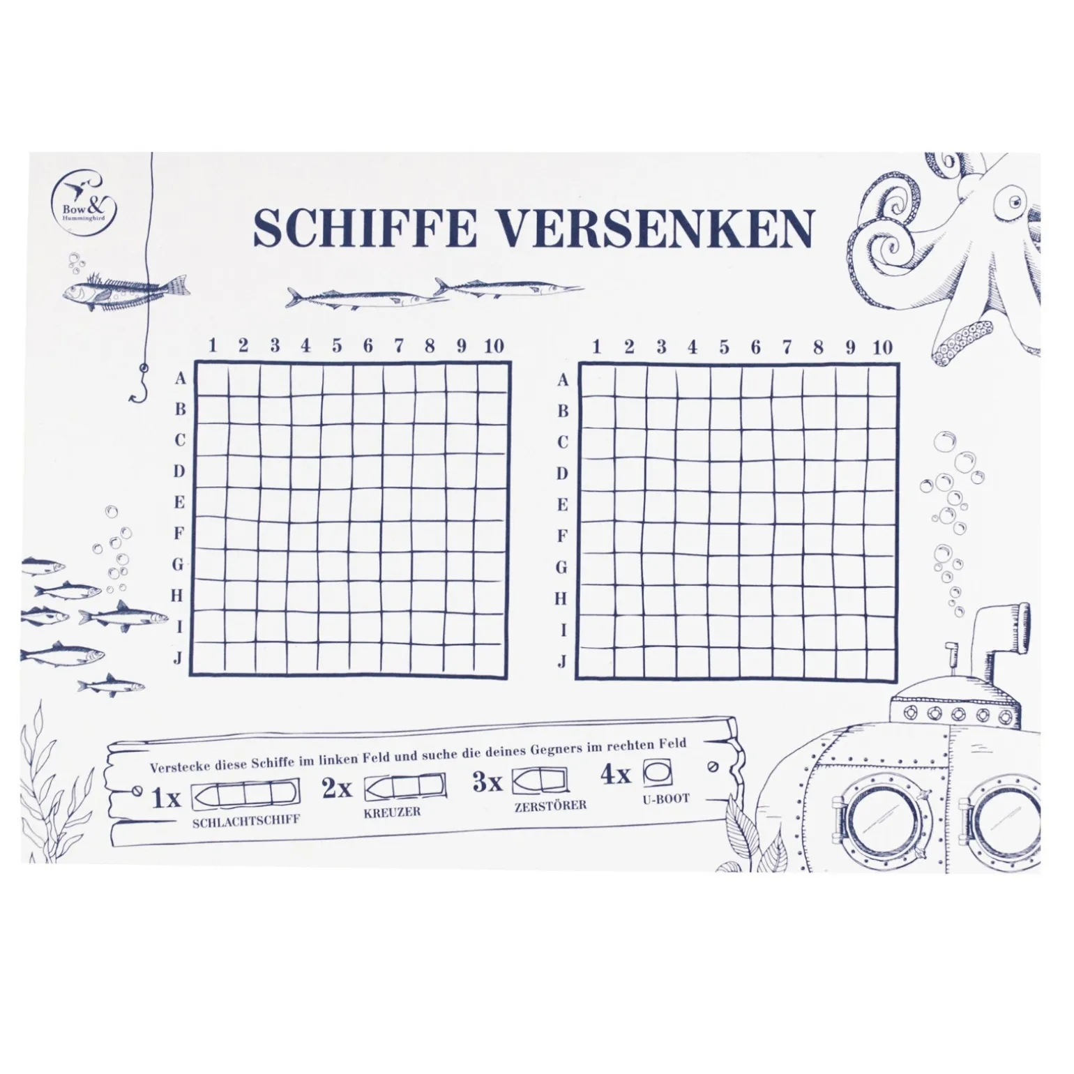Block „Schiffe versenken“ – Das klassische Spiel gibt es jetzt als vorgedruckten Spielblock für alle, die sich duellieren möchten, um ihre Flotte zu verteidigen. Die handgezeichneten maritimen Motive um die Spielfelder herum bringen Euch Kapitänen und Kapitäninnen noch mehr Spielspaß!