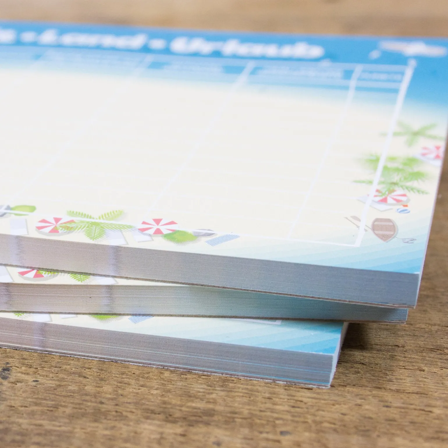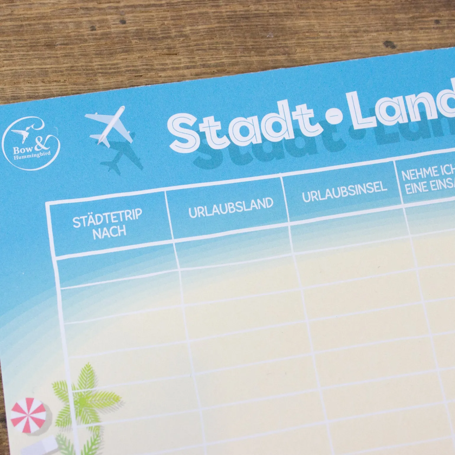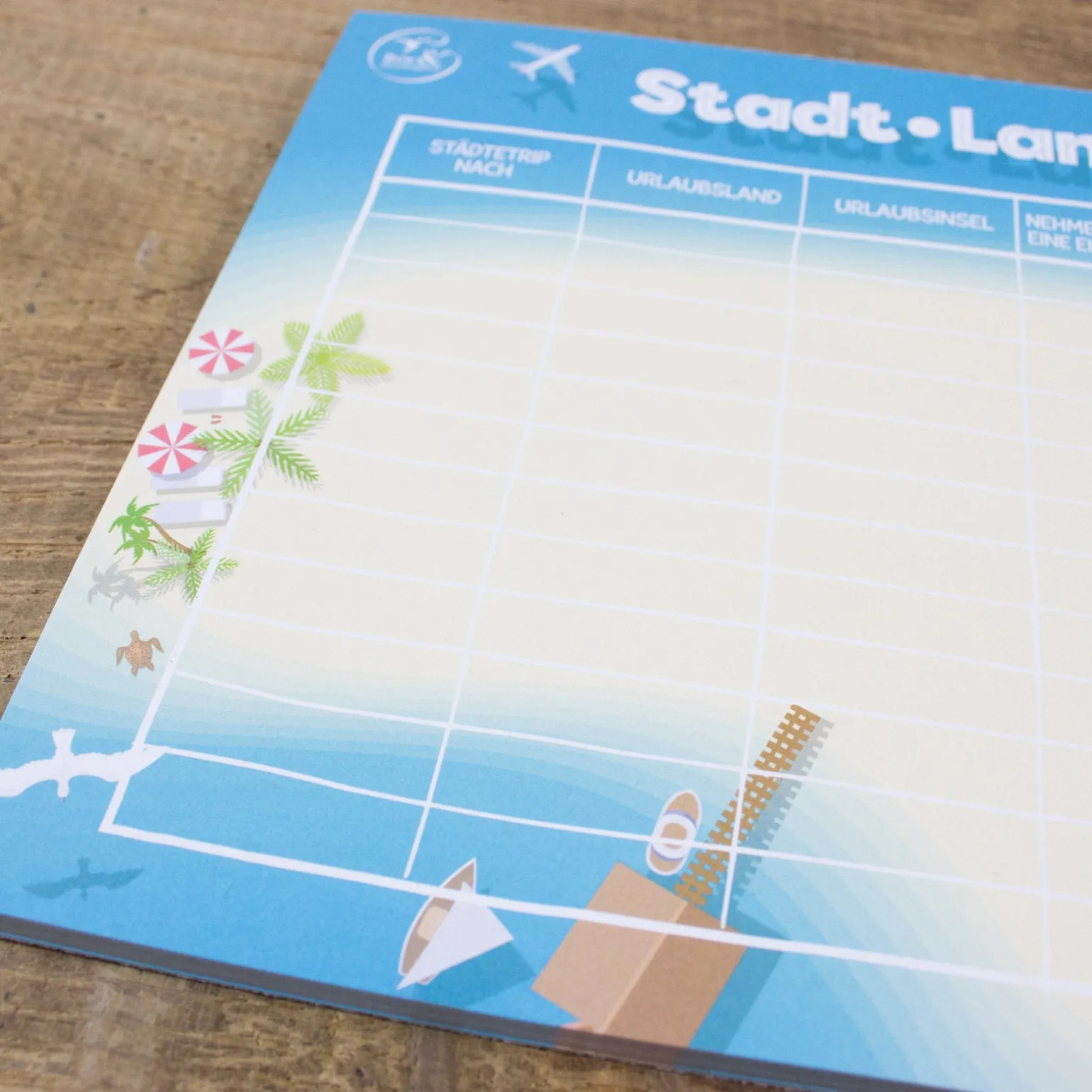 Block „Stadt, Land, Urlaub“ – Das klassische Spiel gibt es jetzt als vorgedruckten Spielblock in der Urlaubsedition. Mit neuen urlaubsreifen Kategorien. Perfekt für den Spielspaß auf Reisen oder am Sandstrand.