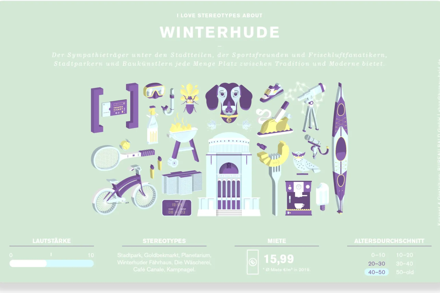 Schön zu wissen: Diverse Fakten und Stereotypes über den Hamburger Stadtteil Winterhude und seine Bewohner verzieren dieses bunte Frühstücksbrettchen.