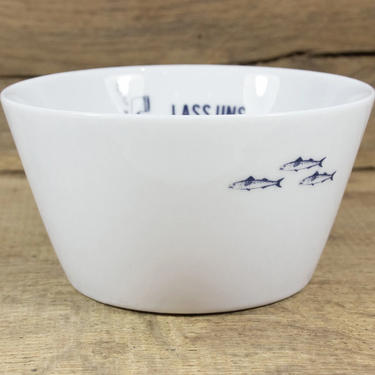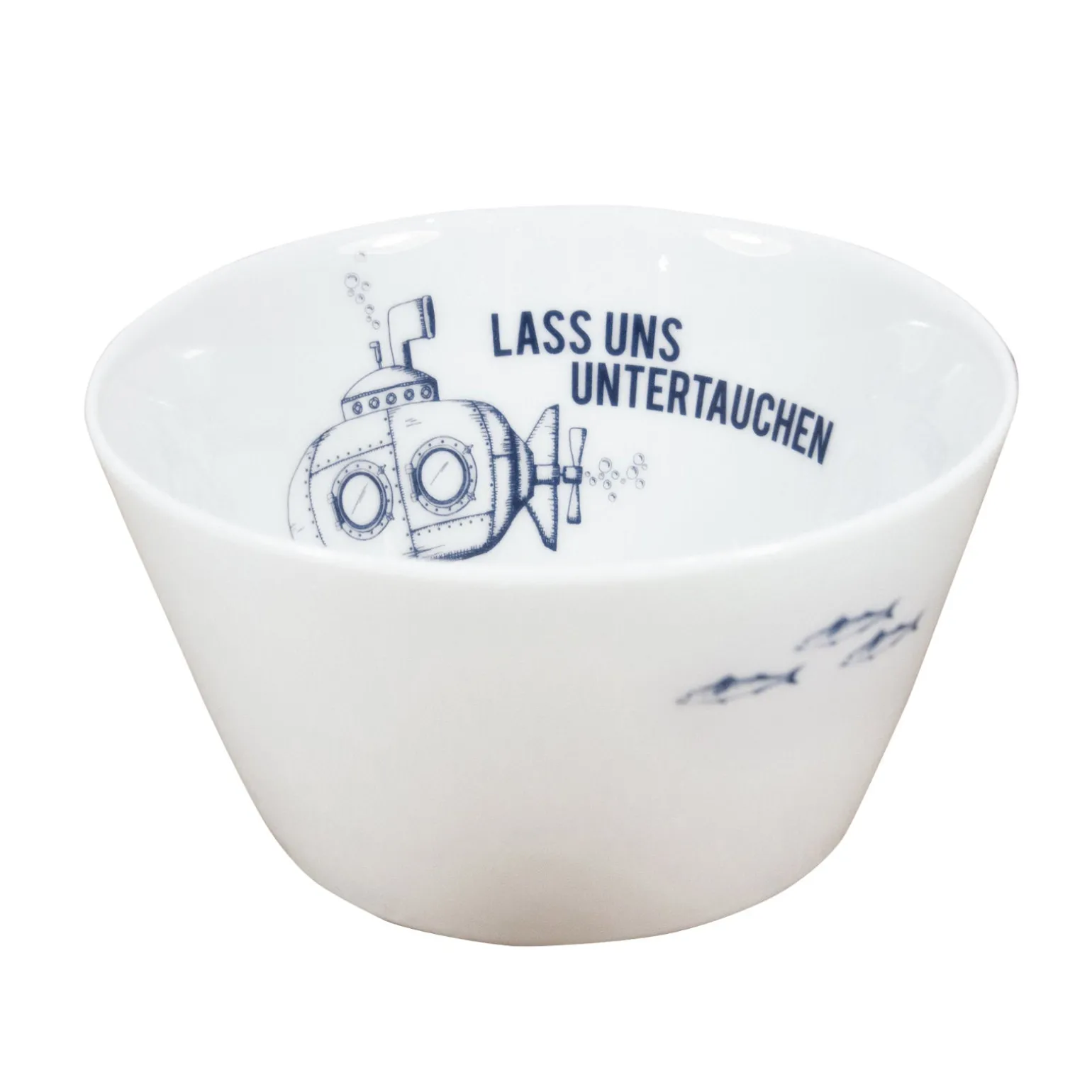 Porzellanschale Untertauchen – Ob mit Müsli und Obst auf dem Frühstückstisch oder mit Knabberkram am Abend auf der Couch. In dieser Schale taucht zu jeder Mahlzeit ein kleines U-Boot unter. Das Motiv wurde per Hand aufgelegt und im Ofen auf das Porzellan gebrannt. Dadurch ist die Schale ideal für den täglichen Gebrauch und ist Spülmaschinen- und Mikrowellenfest.