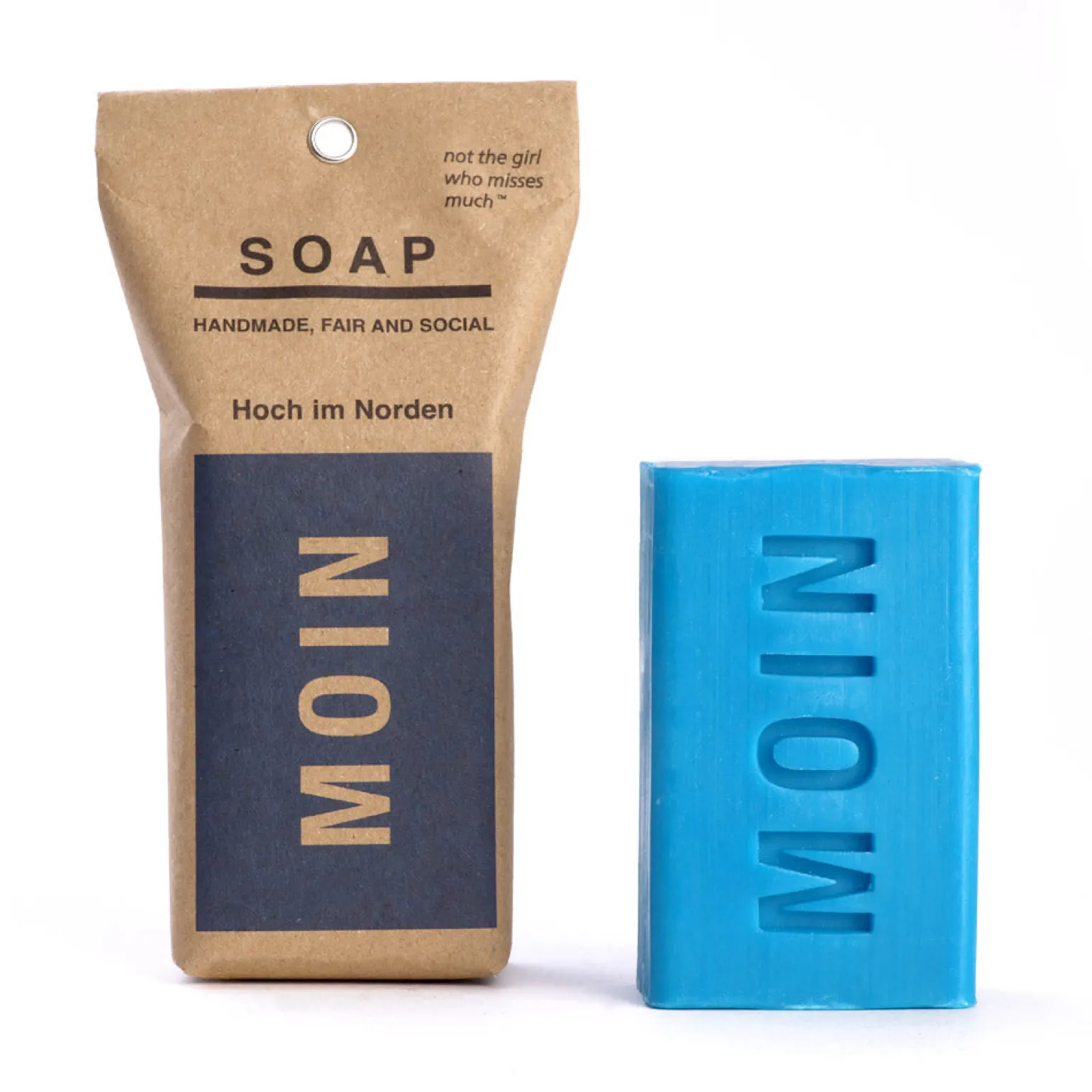 Seife „MOIN“ – Eine Seife, die Bände spricht. Kurz und knackig kommt sie mit ihrem Spruch auf den Punkt. Gegen schlechte Laune und herrlich duftend mit angenehm frischer Ozeannote.