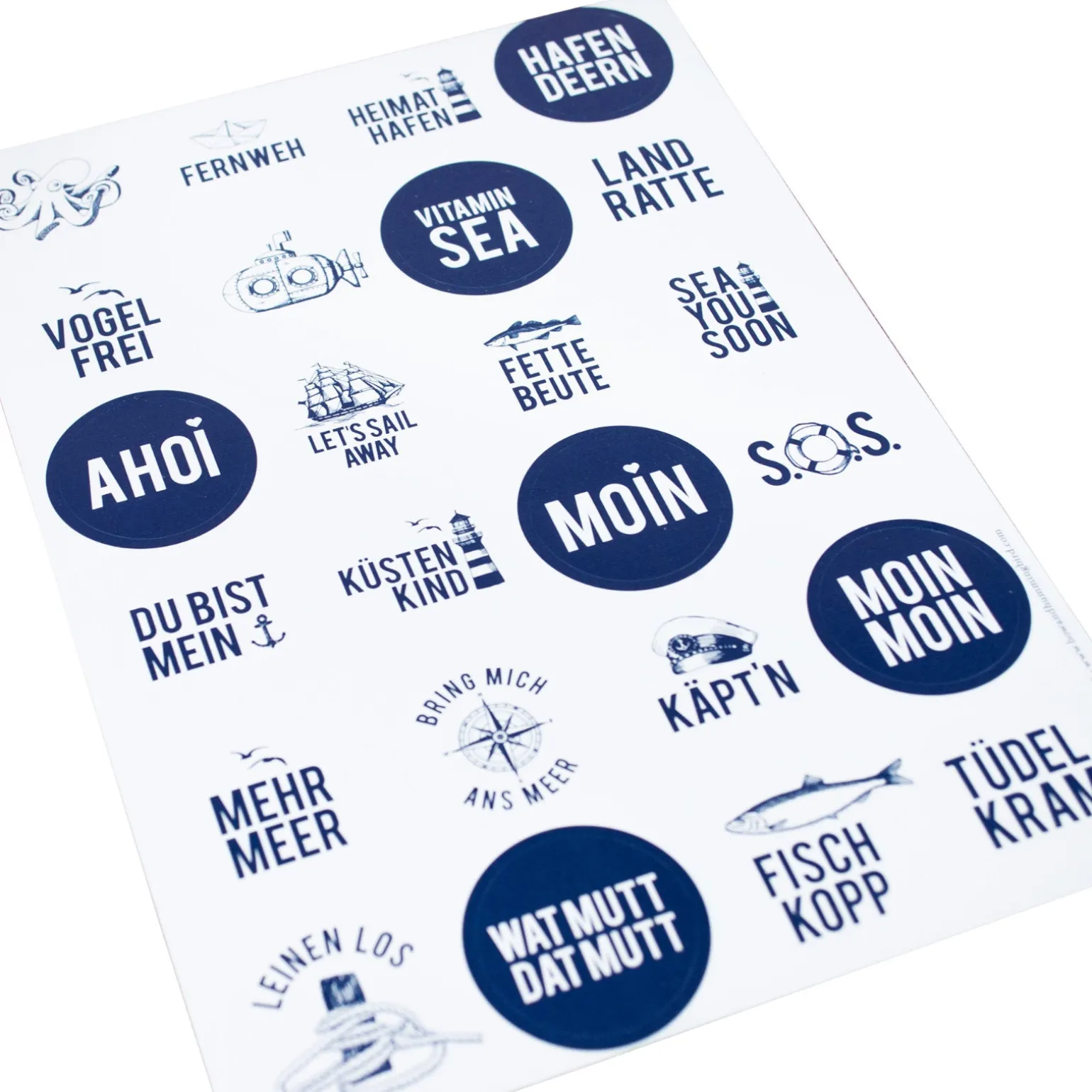 Stickerbogen „Lütte Sticker ll“ – Ein Stickerbogen mit 24 runden Aufklebern mit schönen, handgezeichneten Motiven und Sprüchen im dunkelblauen, maritimen Design. Mit dabei sind Motive wie ein Tintenfisch, ein U-Boot oder ein fröhliches „Moin“, „Ahoi“ oder „Tüdelkram“, die Briefe oder Geschenke stilvoll veredeln.