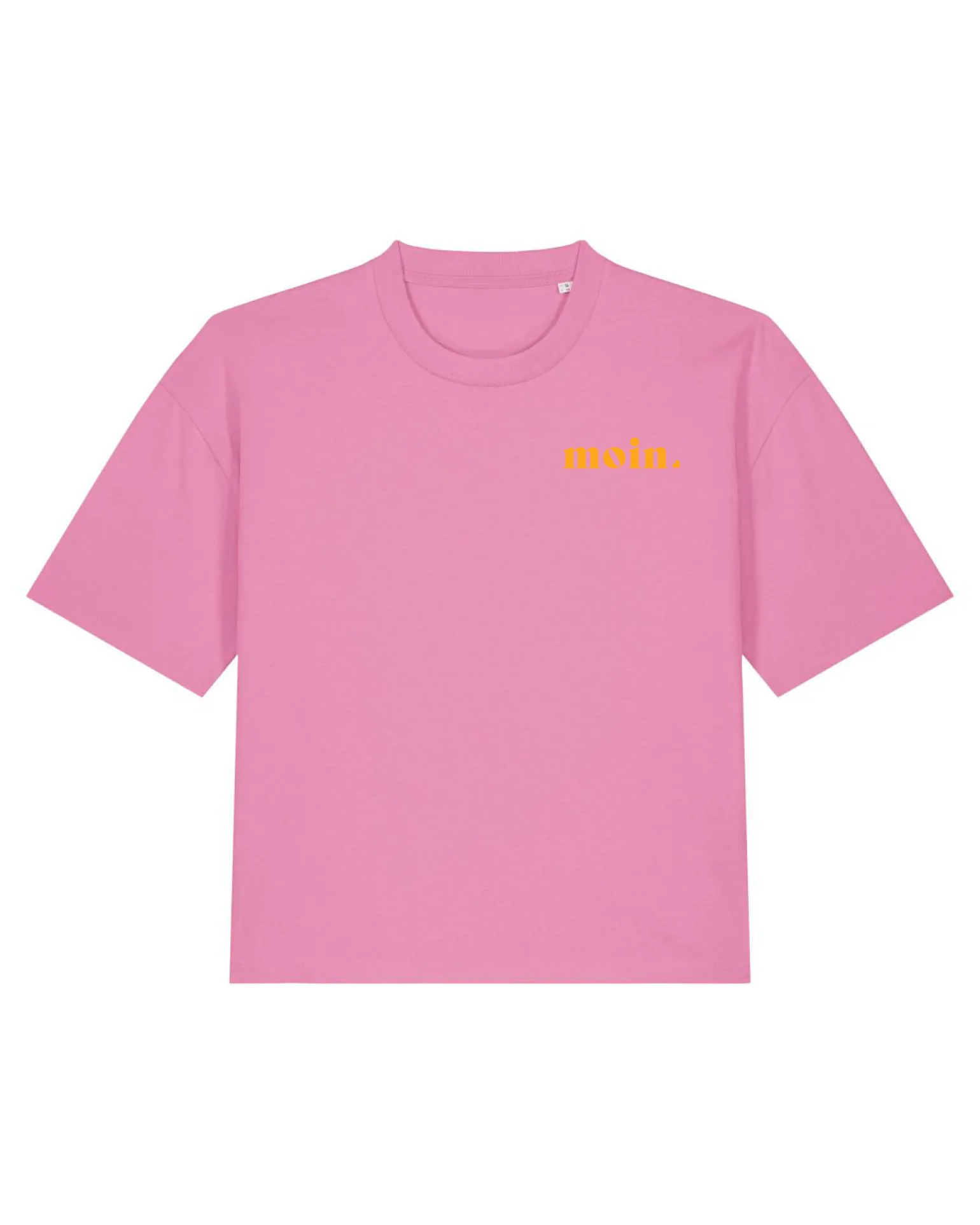 T-Shirt „Moin“ Bubble Pink/Neonorange – Dieses Moin Shirt ist ein weites, leicht cropped T-Shirt in Pink mit einem kleinen freundlichen Moin im knalligen Neonorange auf der Brust.