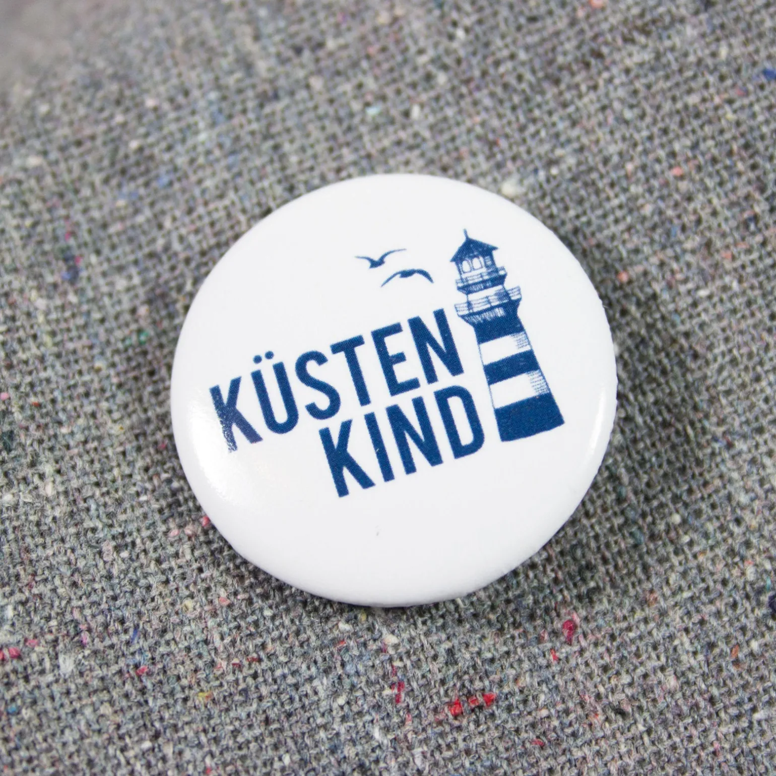 Button Küstenkind – Die Vorderseite ist mit einem blauen, maritimen Motiv auf weißem Hintergrund bedruckt. Die Rückseite ist mit einem Nadel-Verschluss versehen.