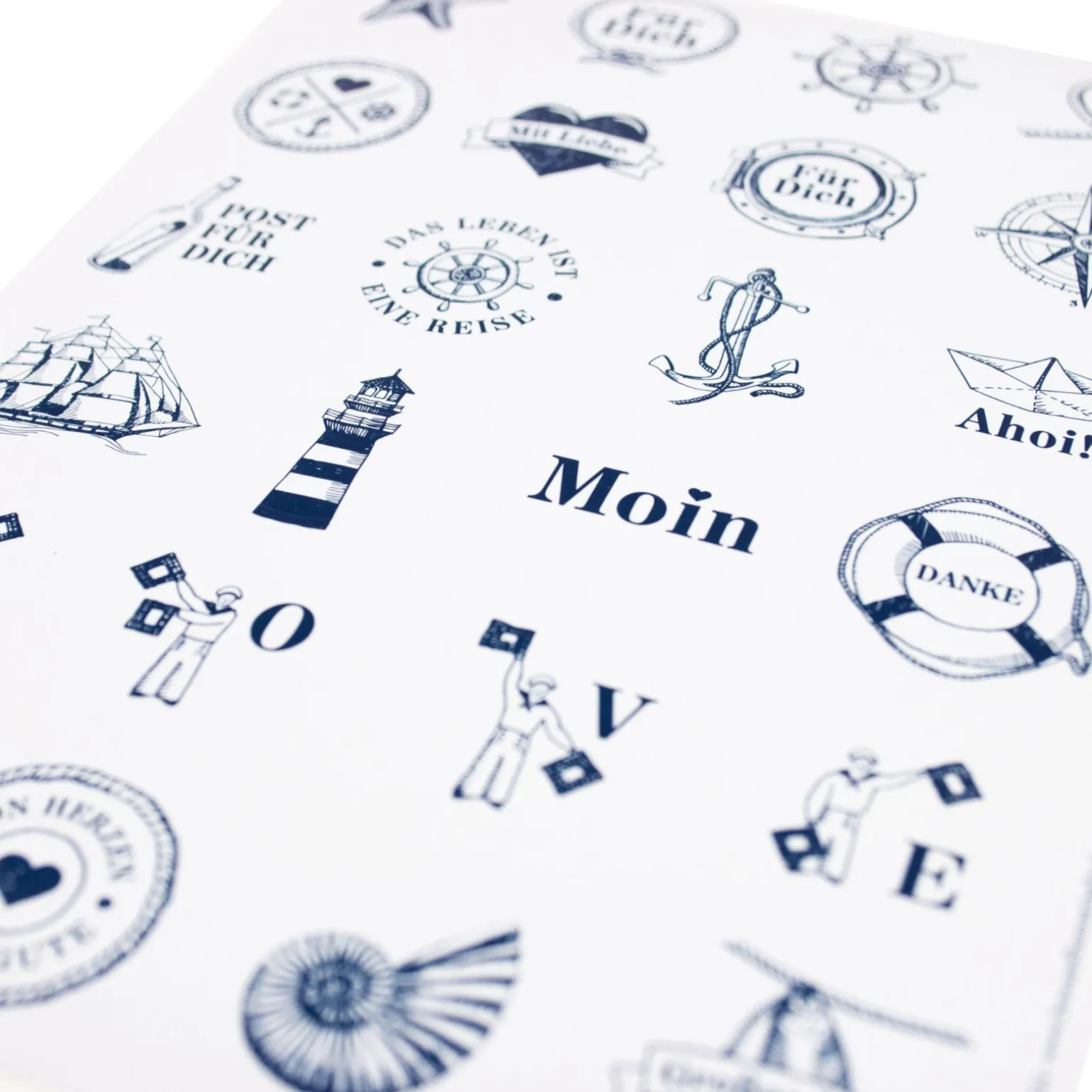 Stickerbogen „Lütte Sticker“ – Ein Stickerbogen mit 24 runden Aufklebern mit schönen, handgezeichneten Motiven im dunkelblauen, maritimen Design. Mit dabei sind Motive wie Steuerrad, Leuchtturm, eine Flaschenpost oder ein fröhliches Moin und Ahoi, die Briefe oder Geschenke stilvoll veredeln.