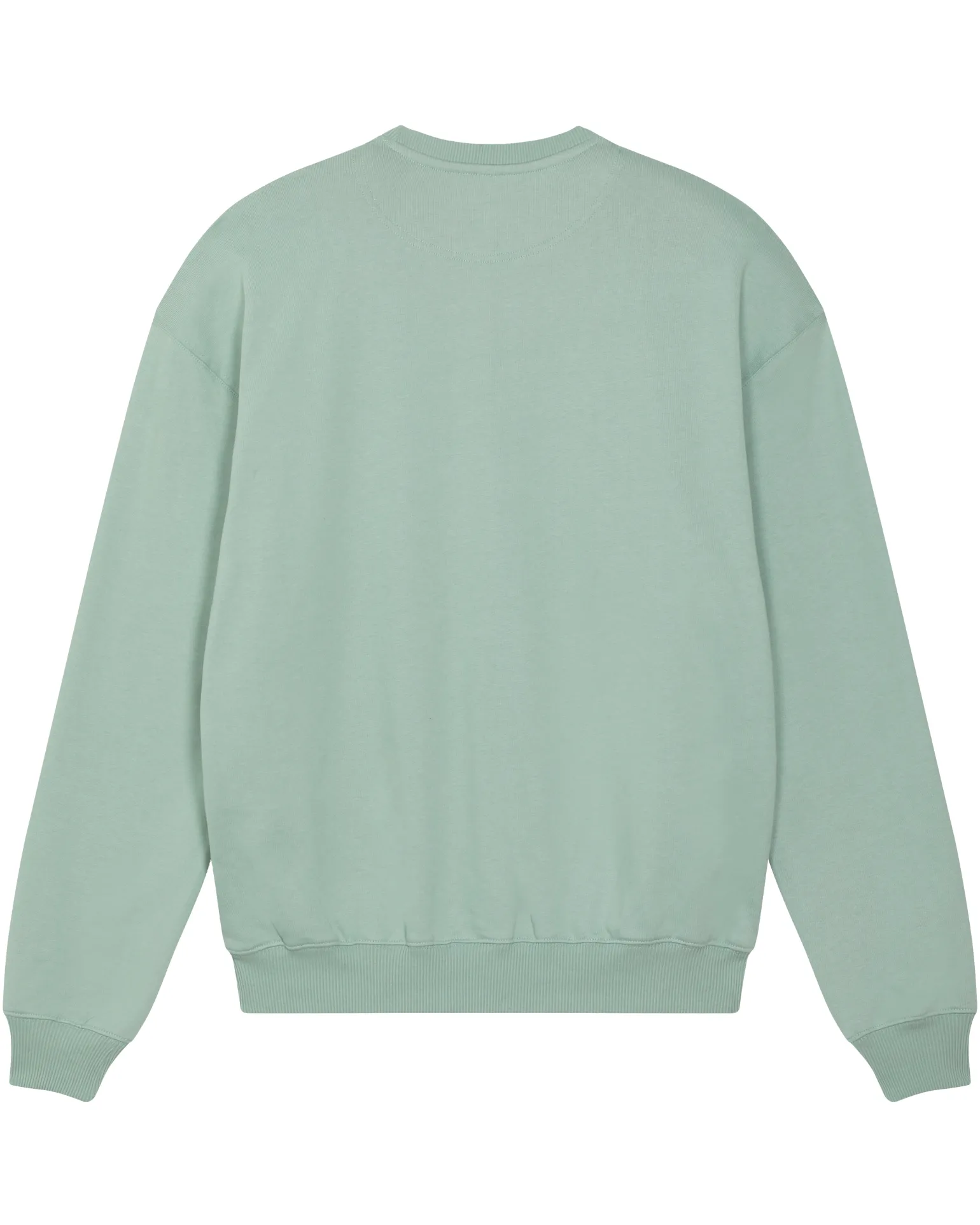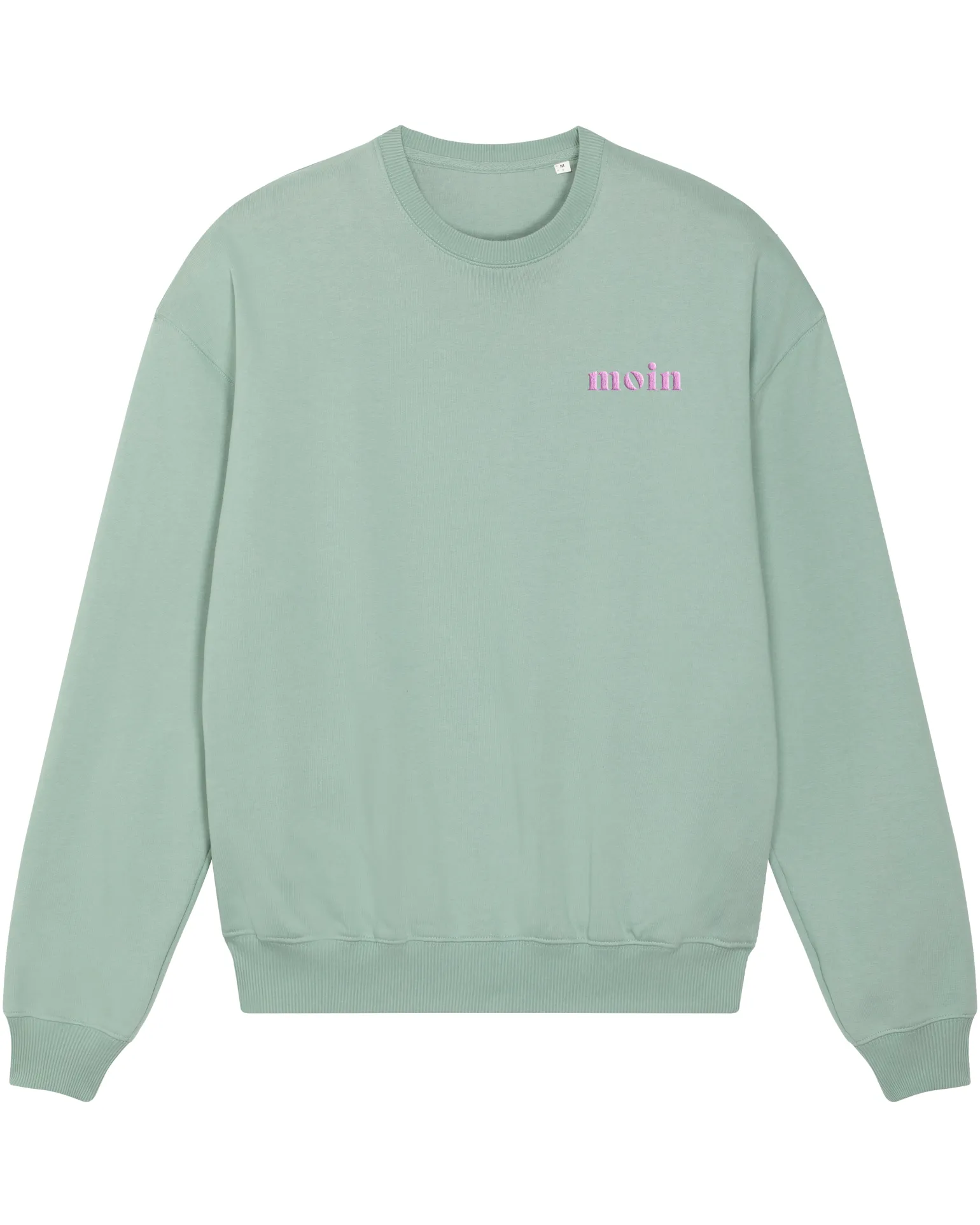 Sweatshirt „Moin“ Aloe/Rosa Stick – Unser Moin Sweater ist ein klassisches Unisex Sweatshirt in zartem Mint mit einem freundlichen Moin in Rosa auf der Herzensseite bestickt.