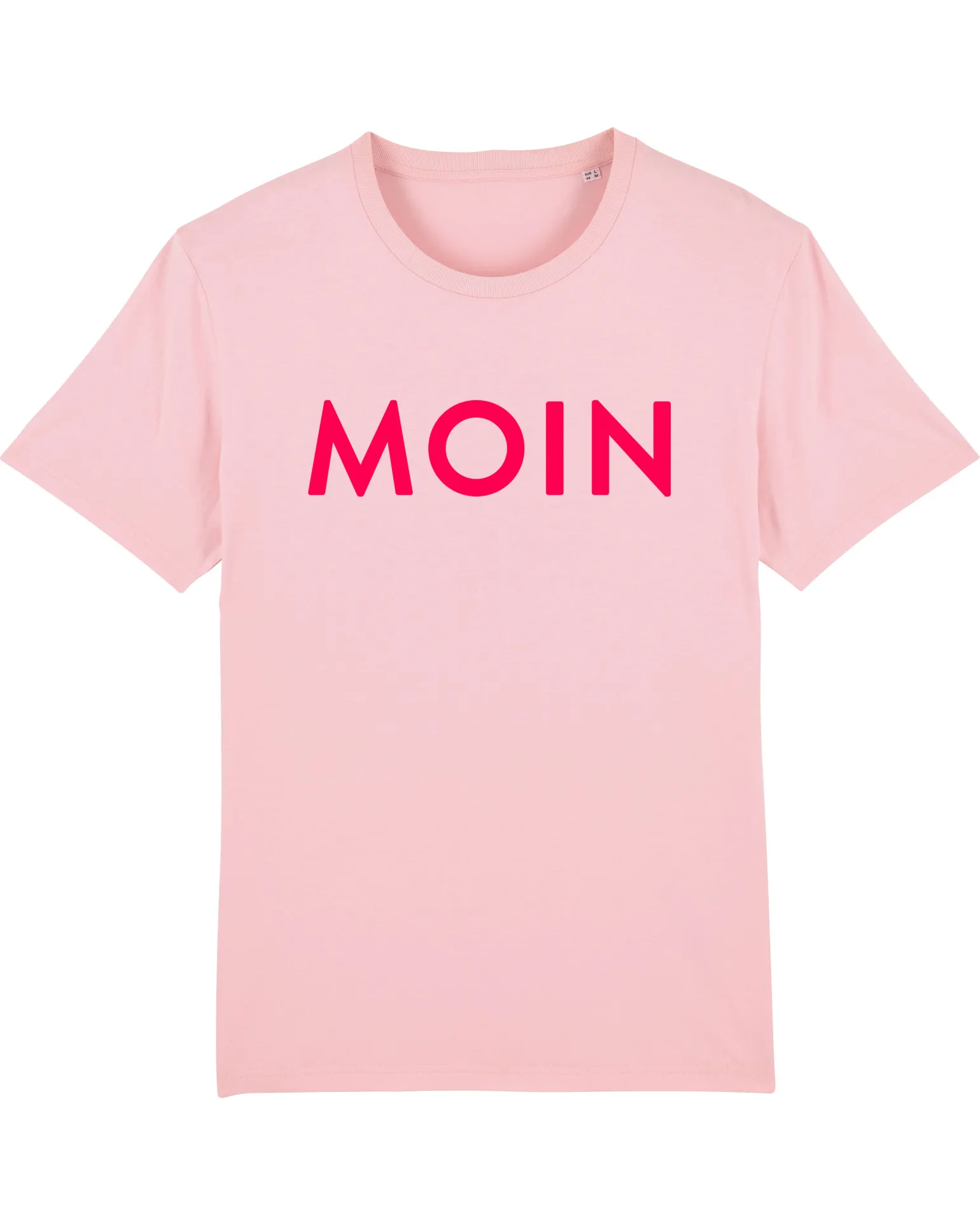 T-Shirt „Moin“ Cotton Pink/Neonrot – Unser Moin Shirt ist ein klassisches Unisex T-Shirt in Babyrosa mit einem freundlichen Moin im knalligen Neonrot auf der Brust.