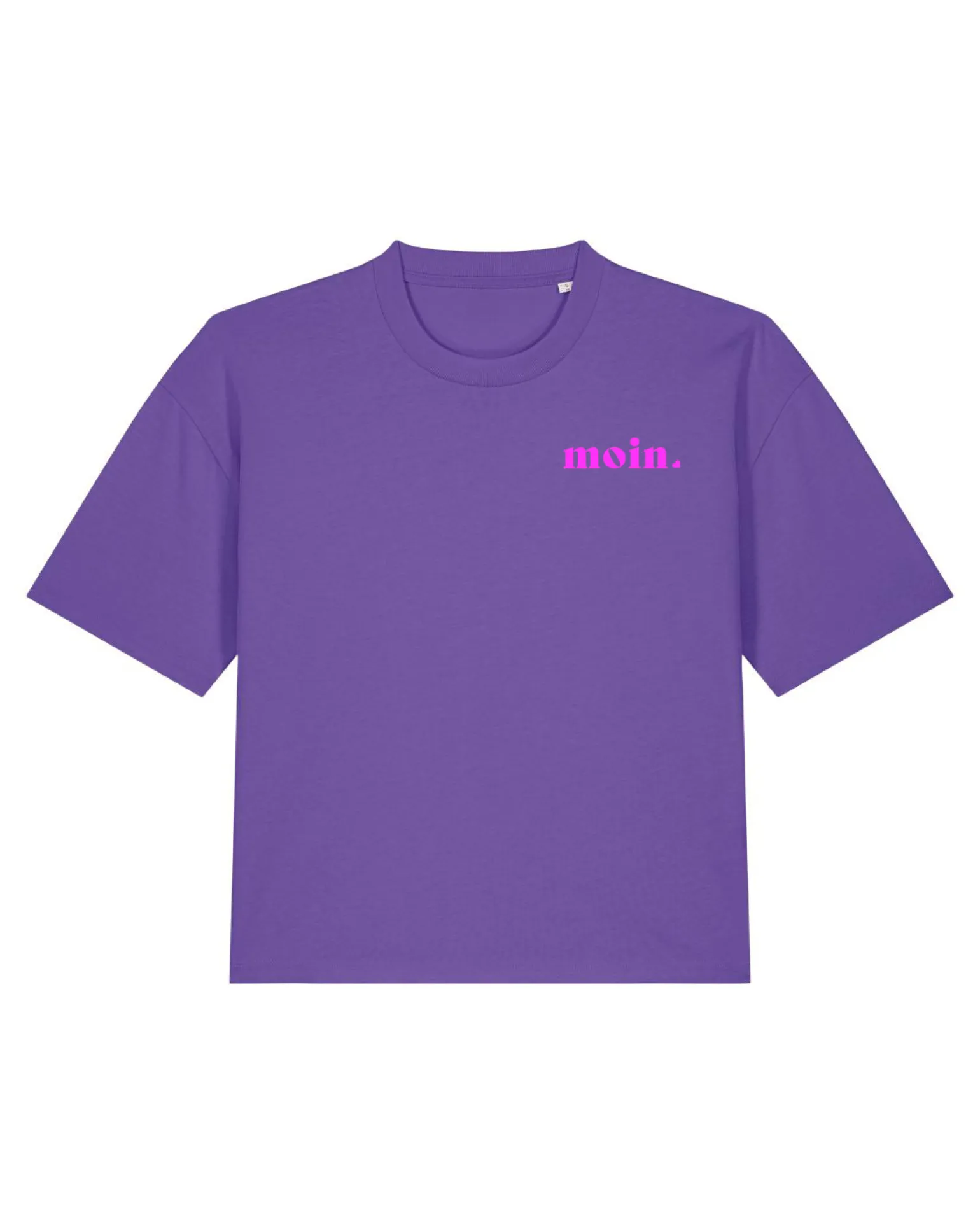 T-Shirt „Moin“ Purple Love/Neonpink – Dieses Moin Shirt ist ein weites, leicht cropped T-Shirt in Lila mit einem kleinen freundlichen Moin im knalligen Neonpink auf der Brust.